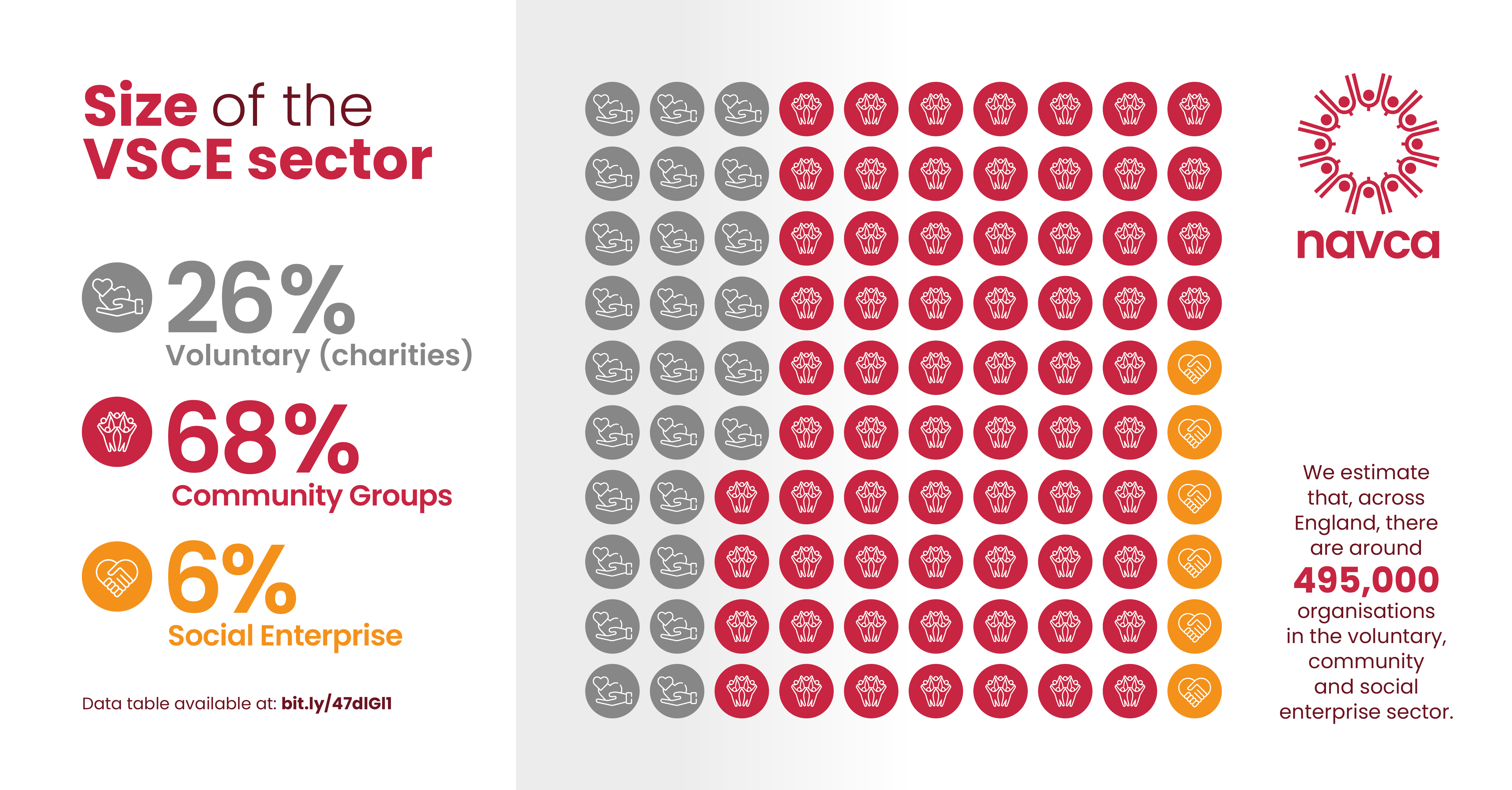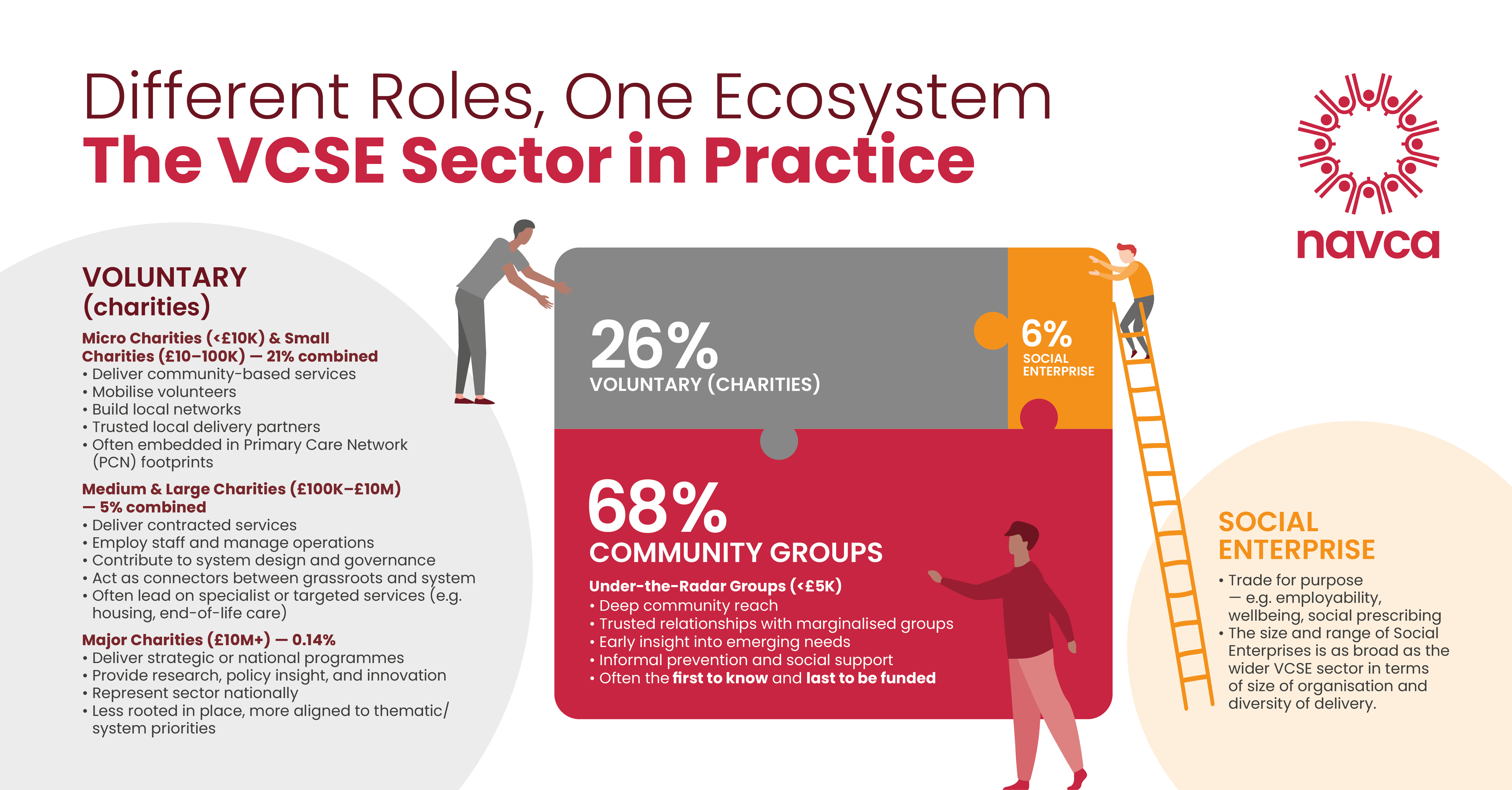 We know it’s not always easy to explain what each part of the VCSE sector is, the scale of its work, or how essential it is to the wider systems we live and work in. That’s why we’ve created a new set of infographics for NAVCA members to share with local stakeholders, such as health systems and local authorities. These explain the makeup of the VCSE sector, highlighting each category and its proportion within the whole.